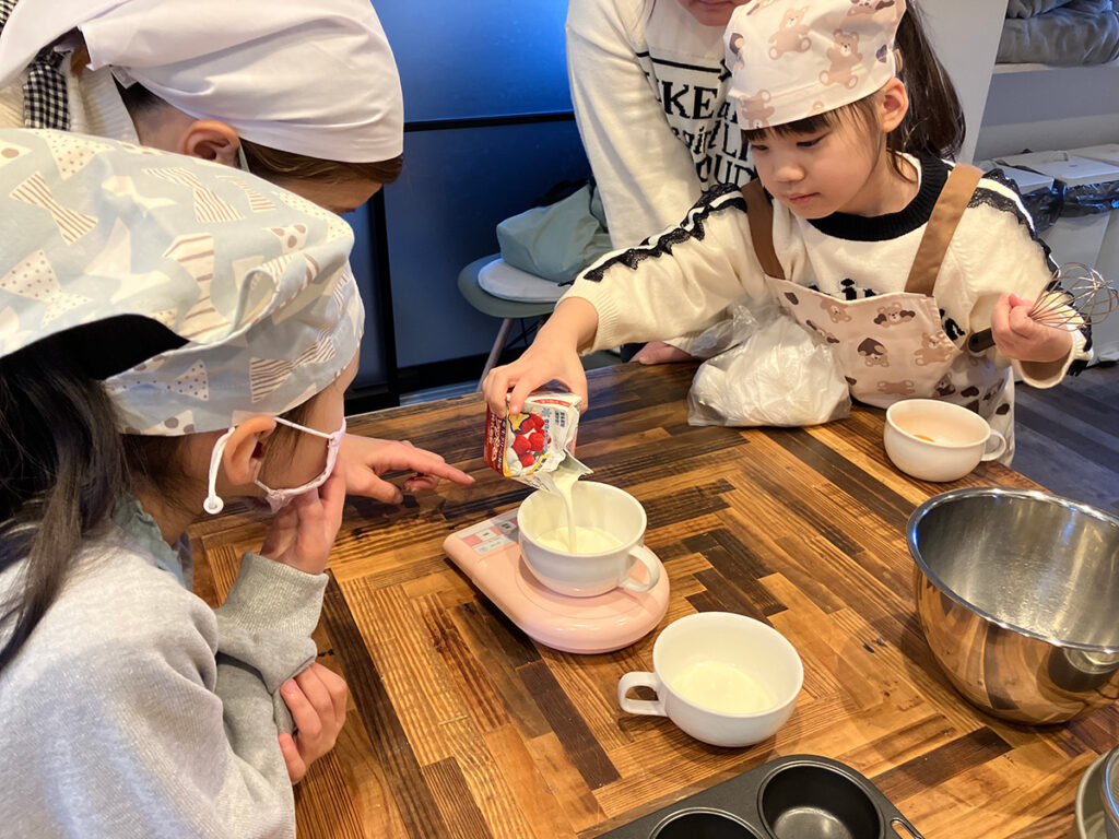 先生の合図で、まずはチームに分かれて下準備。 材料の分量を計ったり順番に交換し合いながら混ぜたり…先生やママといっしょに協力したり、なかには材料を入れるのと混ぜるとで作業を分担したりと、自分たちなりに工夫をしながら一所懸命につくる姿がとても微笑ましいです。
