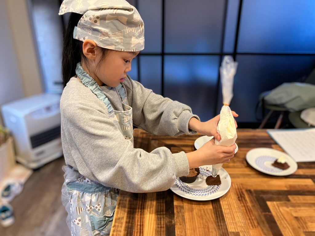 チョコレートの色が温度によって変化することや、クリームのメレンゲを残しながら混ぜる方法など、説明やお手本を加えながら一つひとつの工程を丁寧に教えてくださいました。