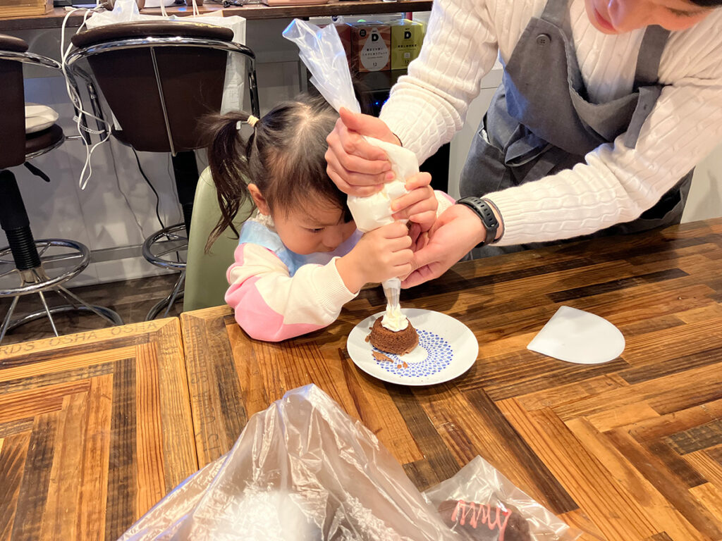 待っている間も先生が用意した試食用のパウンドケーキをつかい、思いおもいにデコレーション。